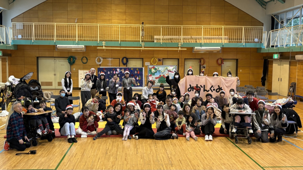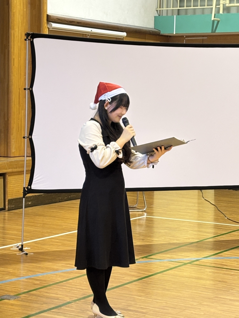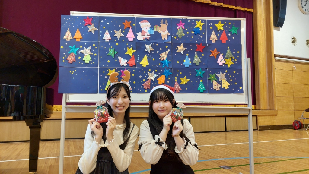 最後に、サンタさんからプレゼントをお渡ししました。一人一つ鈴を配ってみんなできらきら星を一緒に演奏しました。さらに、学校の音楽室にある楽器を用いて、全員できらきら星とみかんぐみオリジナルソングの「だいじょうぶだよ」を演奏しました。鈴だけでなくトライアングルやタンバリンも使って様々な音色を楽しみました。